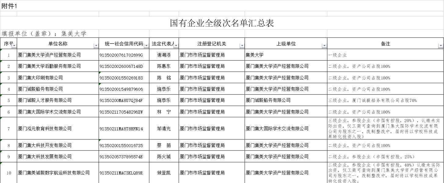 根据福建省相关行动部署,现将集美大学国有企业全级次名单公告如下: