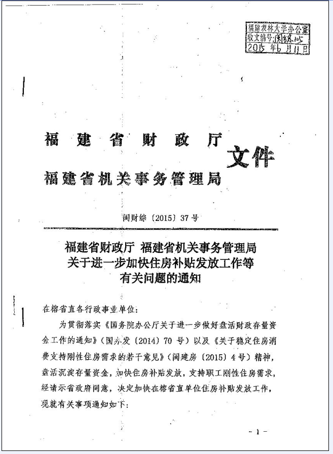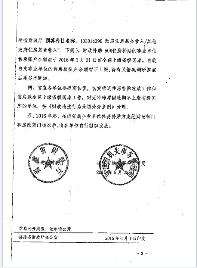 闽财综[2015] 37号 福建省财政厅福建省机事务管理局关于进一步加快住房补贴发放工作等有关问题
